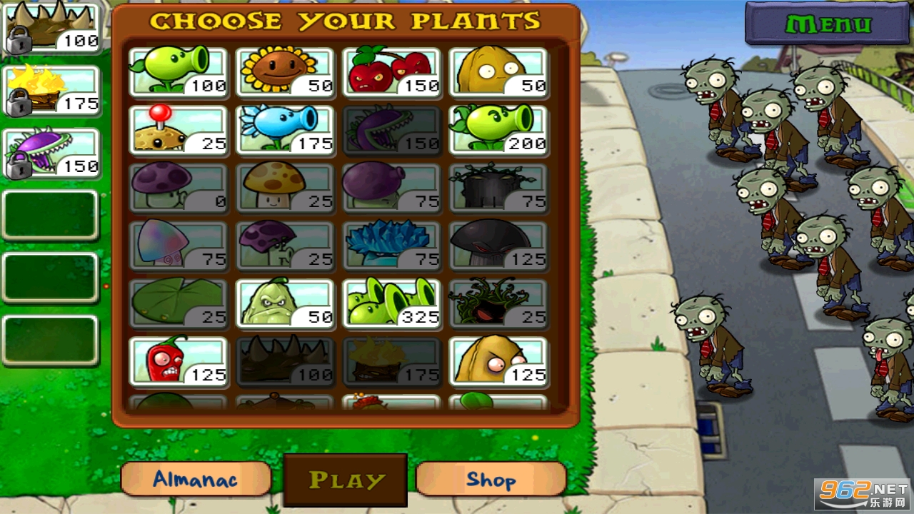 游戏共有26种不同的僵尸敌人,包括开着车子的雪橇车僵尸和投石车僵尸等。49种功能互不相同的植物,并可收集硬币购买蜗牛等多种道具。打开图鉴,就可以看到植物与僵尸的详细介绍。