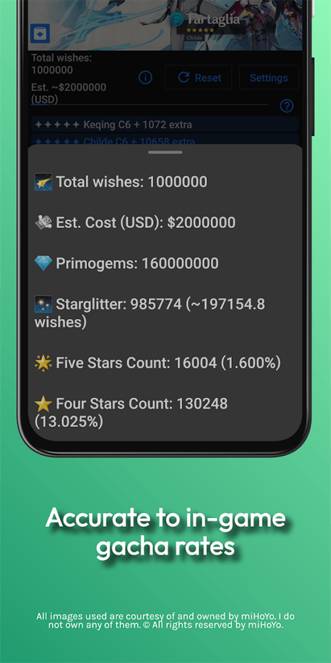 4、轻巧,简洁。适用于游戏中的gacha速率,包括可怜和可怜的怜悯。跨越1,000,000个愿望的仿真:五星级为1.602%,四星级为13.013%。
