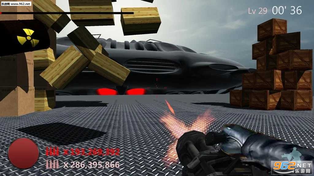 您在一个高悬空甲板上,请击落所有箱子,并防止击中核油桶,防止核弹落地等等。。