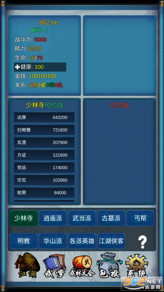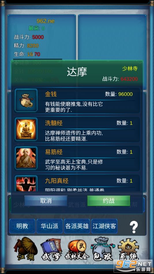 请量力而为,约战武力较低的对手,以在下一轮战胜他,获得对方的金钱和武林秘籍。
