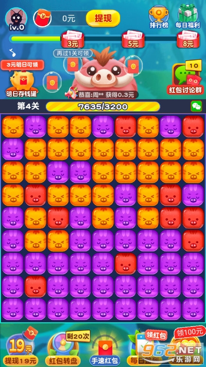 《猪猪爱消消游戏红包版》是一款非常有意思的益智类消除闯关游戏,玩家们通过点击操作的方式来完成不同关卡内的宝石消除,获得更多的红包累积奖励,在自身等级达到1级以后,能够将一定数目的金币以提现的方式转到个人的账户当中去。