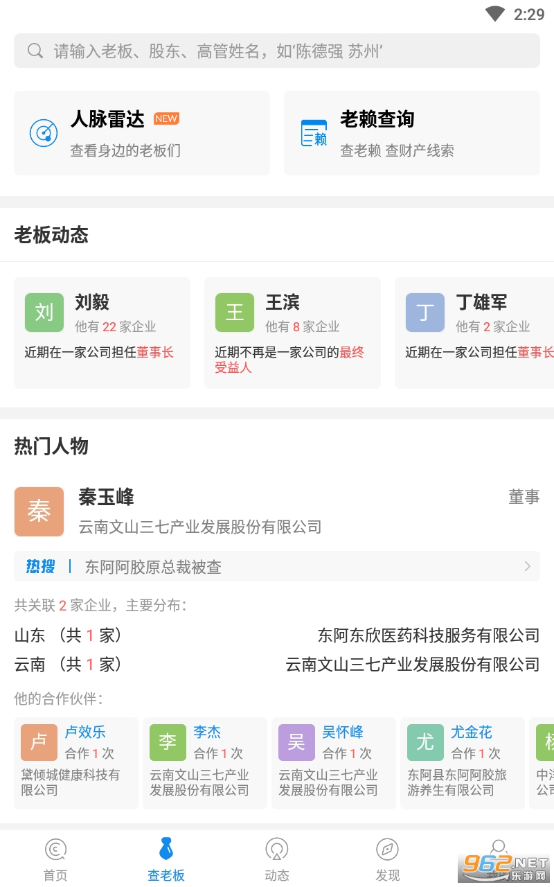 【查关联公司】支持人名去重功能,输入老板、股东、高管姓名,可按地区、行业进行筛选查询。
