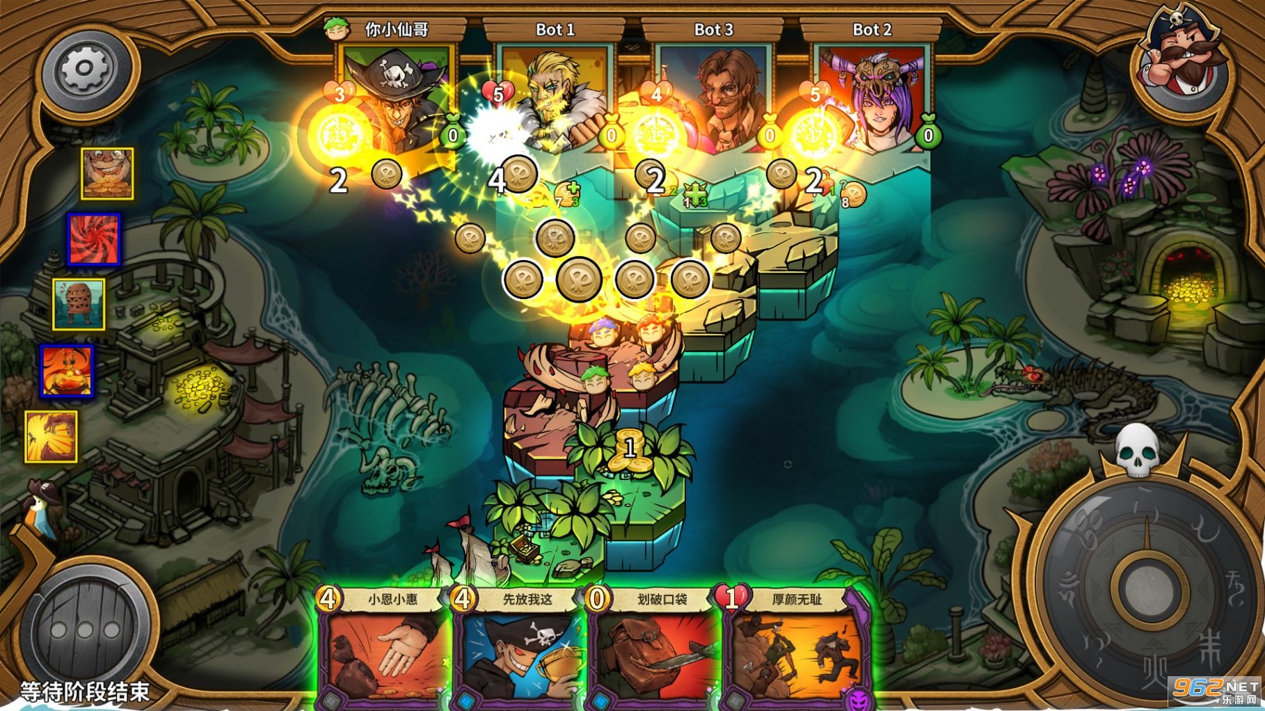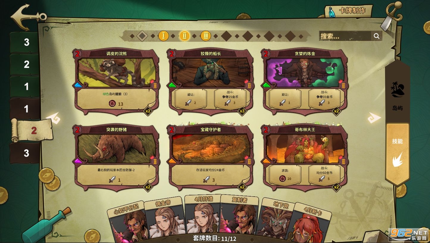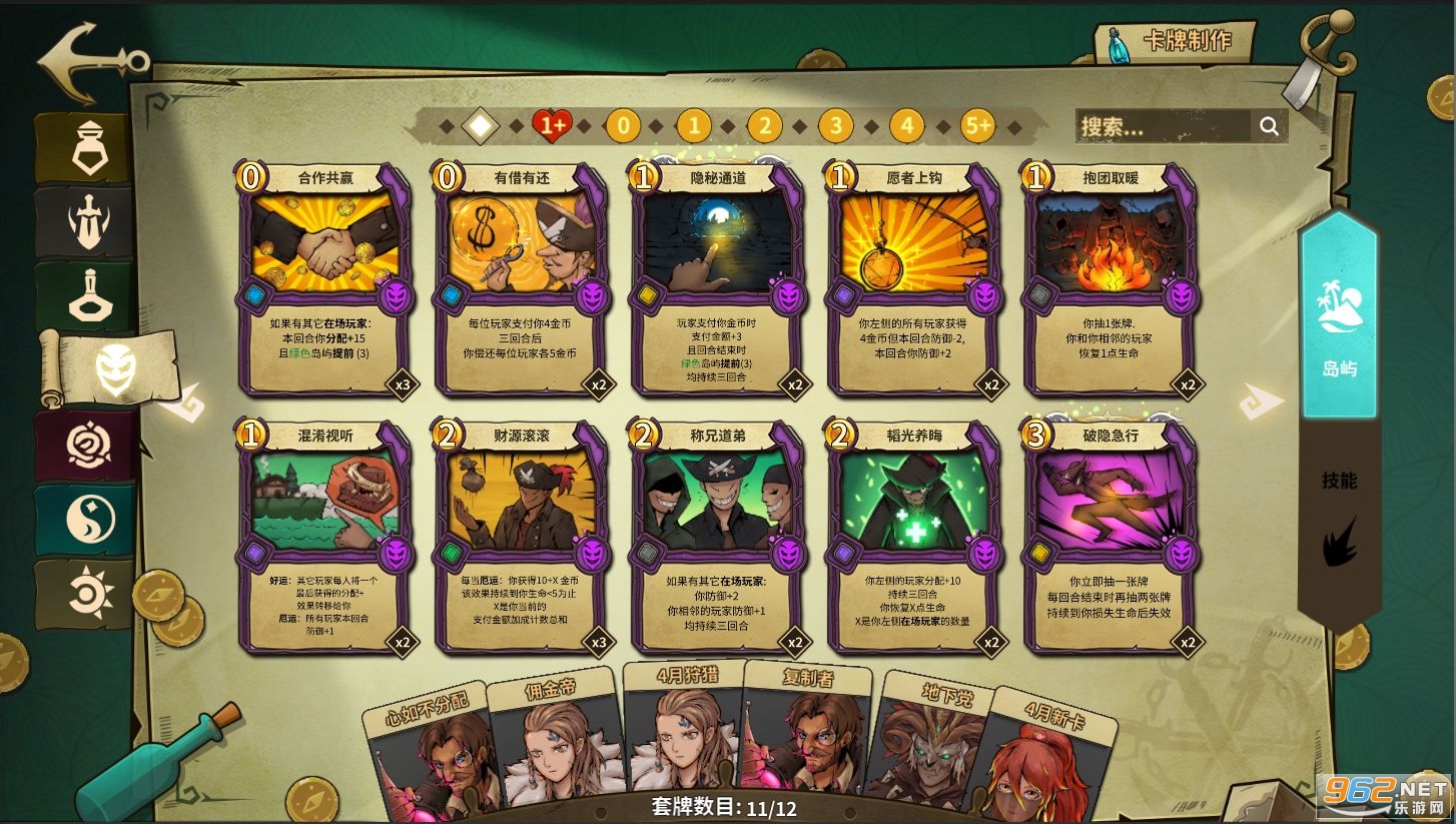 点石成金的炼金术士;阴险狡猾的欺诈者;身经百战的佣兵;神秘古怪的巫医。每个角色都有属于自己的专属卡牌,巧妙的运用每个冒险家的才能,搭配符合你战略体系的岛屿卡牌,制定属于你的冒险计划.