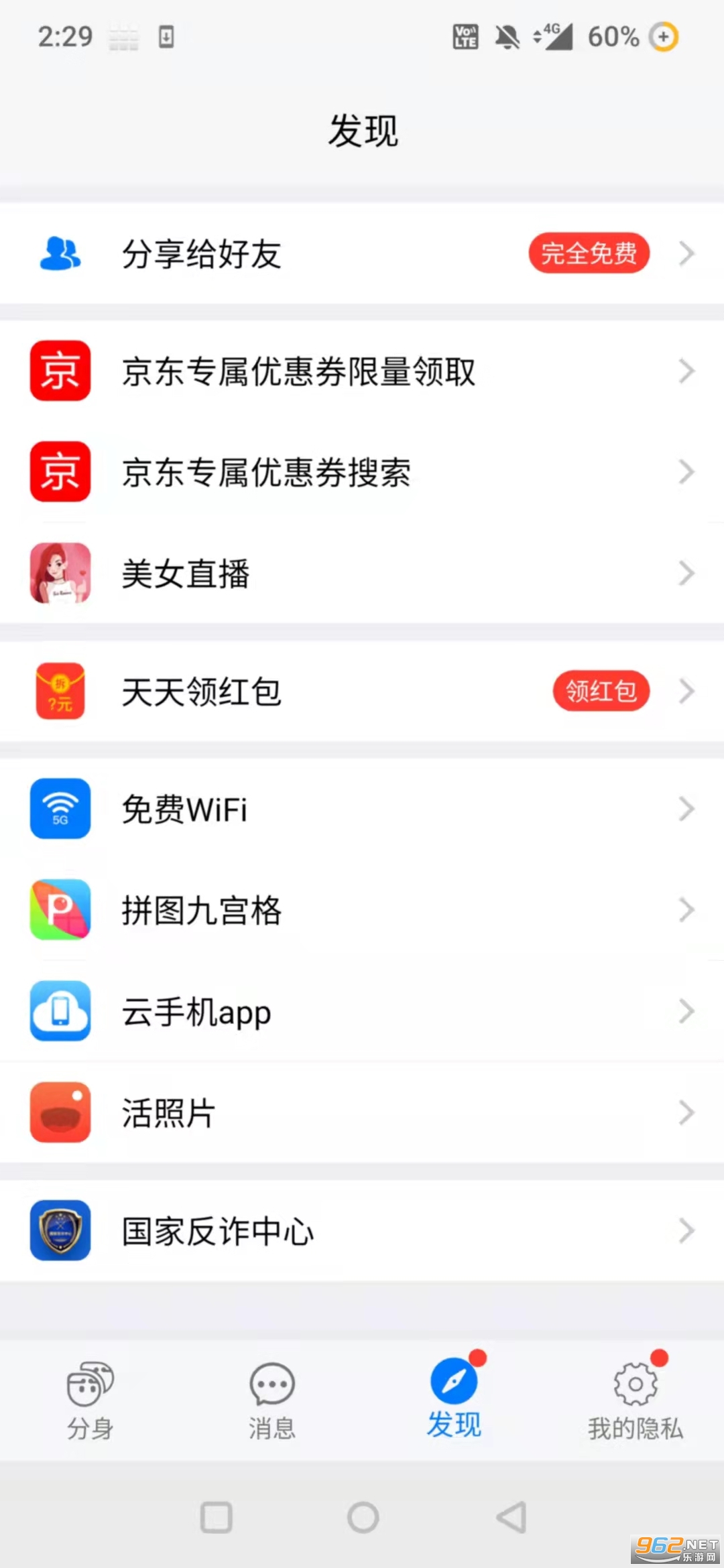 22项权限免费应用分身、放桌面、朋友圈、小程序、相册、游戏王者荣耀改战区等功能,启动手机内的正版分身版,实现双手机效果,不存在恶意下载等消耗流量行为。创意新增91视频无限新用户、王者战区移民功能。