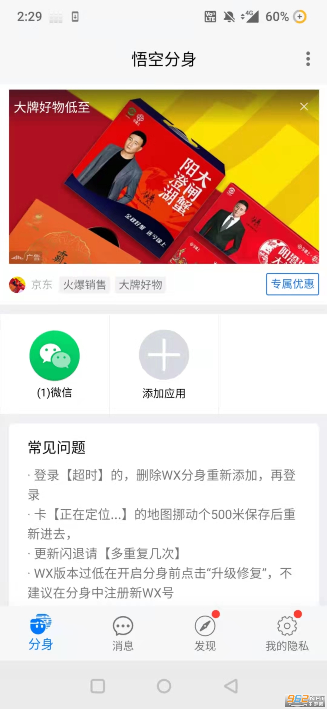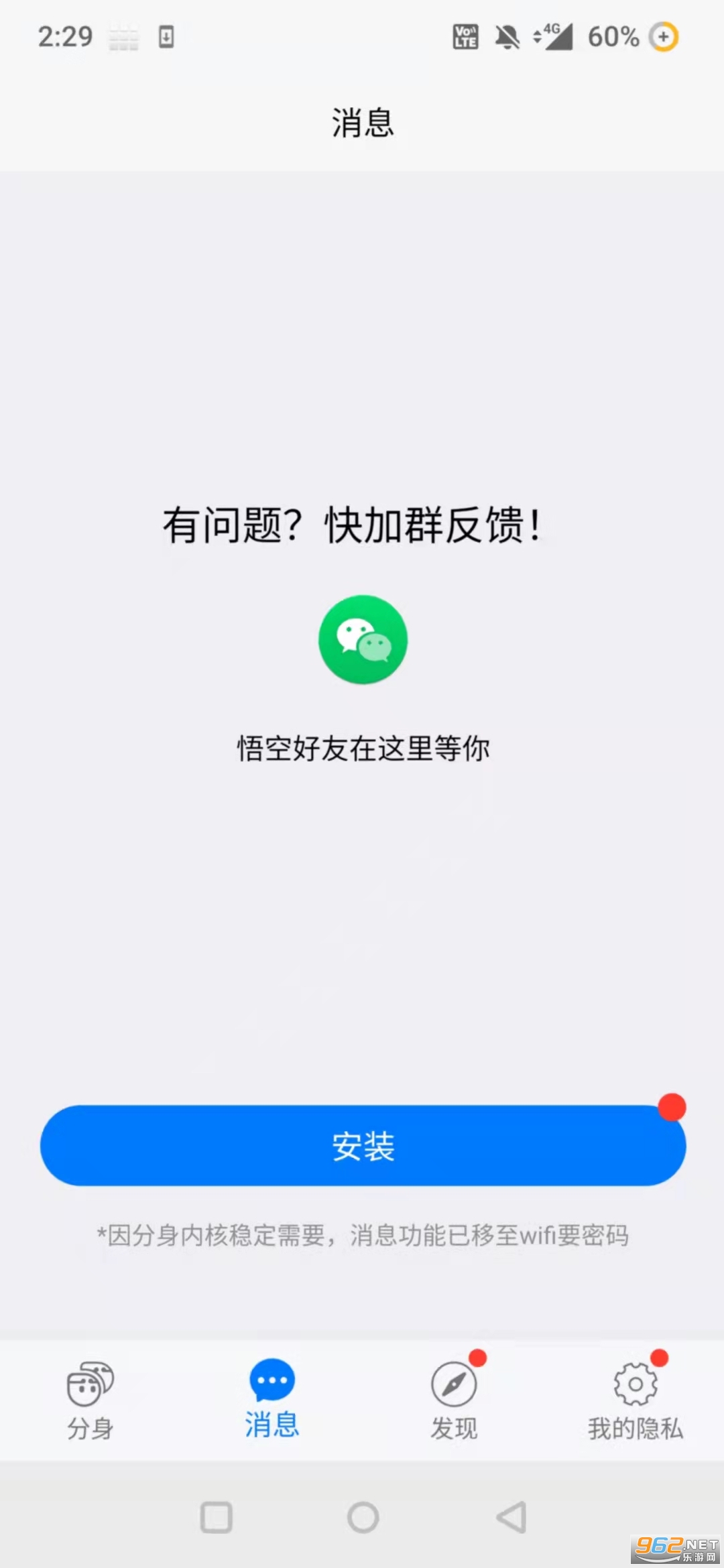 《悟空分身最新版本》是一款为朋友们打造的免费多开软件,悟空分身app有着强大的多开功能,可以帮助朋友们在手机上多开多个,可以登录多个账号,而且而且还有着朋友圈、信息通知等各种功能,让你在一个手机上可以使用众多的。