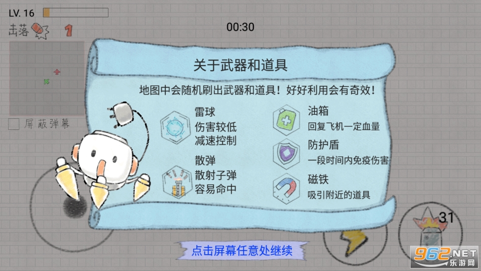 画风简约的一款飞行射击游戏,采用了手绘的游戏界面射击,里面有着丰富的武器,玩家需要驾驶你的小飞机,拾取各种各样的道具,在场景中干掉其他的飞机,完成任务!