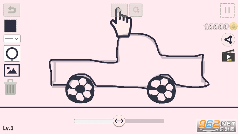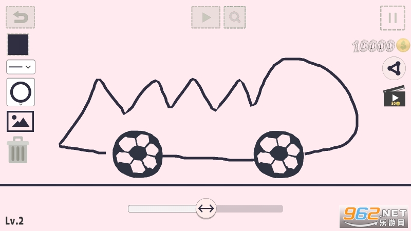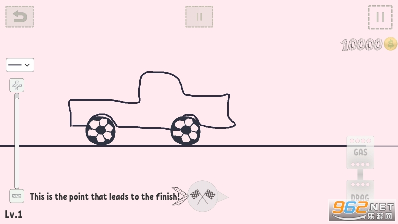 我们先简单的了解一下游戏的规则,游戏设置一个起点和一个终点,中途的路线是通过自己的想法绘制出来,起点处有默认有连个轮子,需要您绘制汽车外形,绘画完成点击开始按钮即可开始游戏。屏幕底部中间的位置有一个终点标志,按着终点标志提示的方向绘制路线即可。