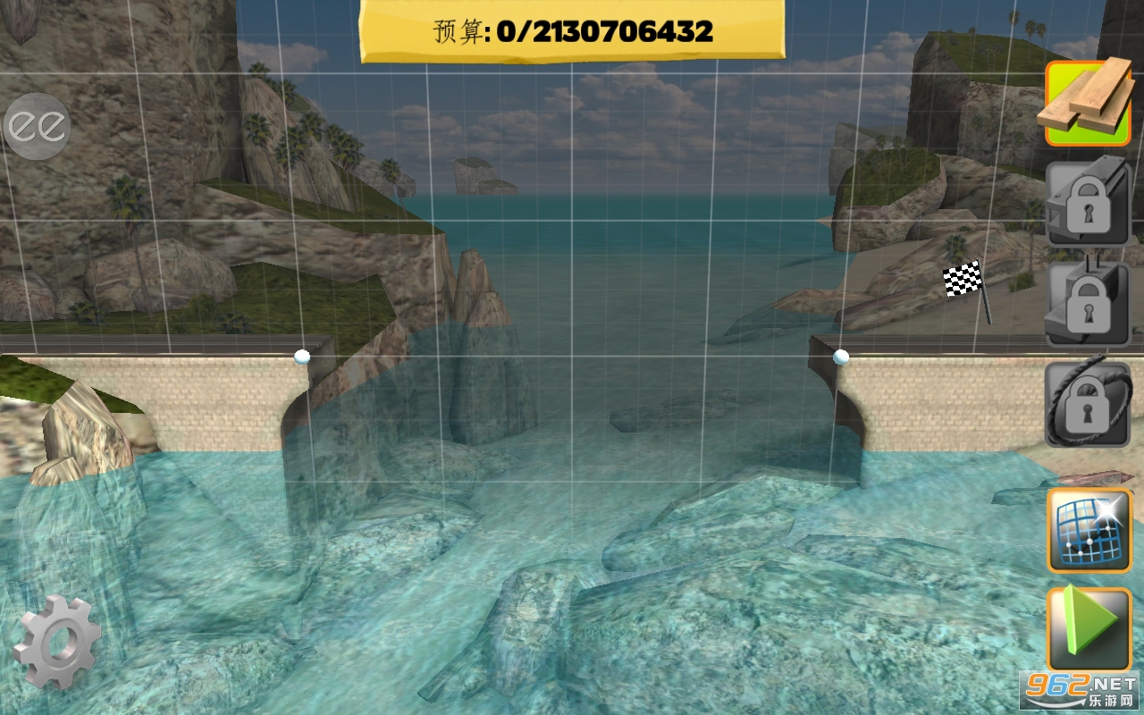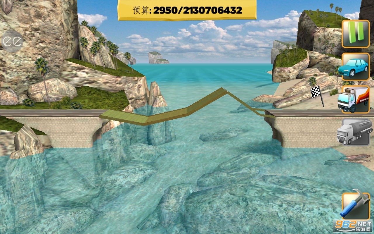 第五关:这一关资金比较充裕,但是只能使用木条,需要先铺设桥面,然后从桥面将木条延伸到桥墩。