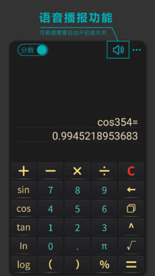 本应用提供分数计算,支持语音播报,还支持普通的加减乘除计算,以及根号计算,另外可以单独计算一些高级算法。