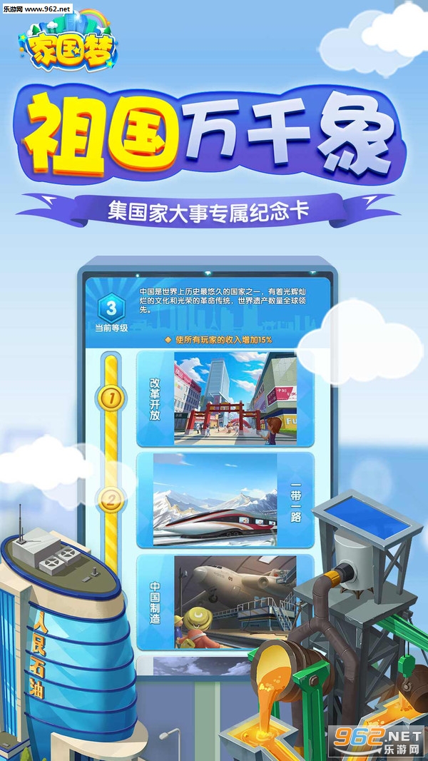 由腾讯游戏与人民日报联合推出,是一款展示新时代国家发展的,放置类城市建设游戏。在自主建设的城市内轻松乐翻天,用扶贫攻坚、绿色出行、减税降费等政策一步一步共建家乡和祖国,还能感受祖国大江南北的地域文化特色,诸如北京烤鸭、兰州拉面等等;更有300+张家乡实景绘图。快和朋友们一起,实施最合适的政策,完成城市发展任务。