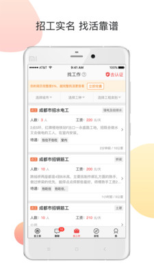 找工作是成都集致生活科技有限公司开发的一款专门针对建筑工友招工找活的手机软件,无 论是发布项目方还是找活的工友都需要进行实名认证。如果你是班组长你可以到APP【招聘 】版块去发布招工信息让工人联系你,或是购买班组长认证服务获得平台推荐,优先展示,