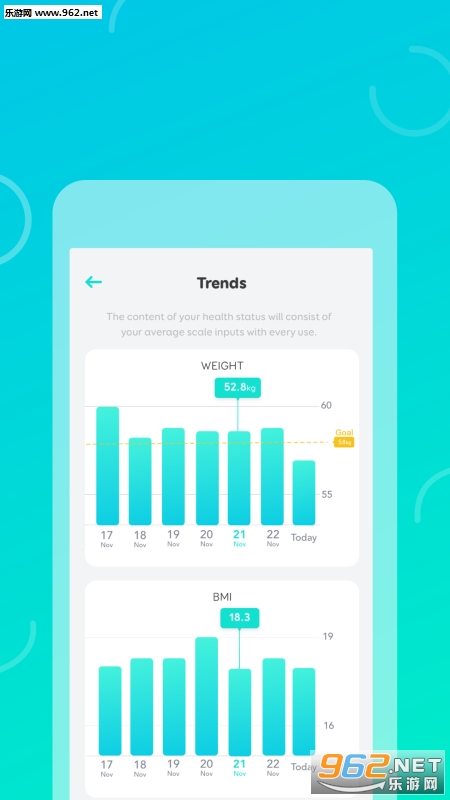 追踪12个测量值:体重,身体脂肪,体重指数,水,肌肉%,骨%,脂肪,内脏脂肪,瘦体质量,体脂质量,骨量,肌肉量。