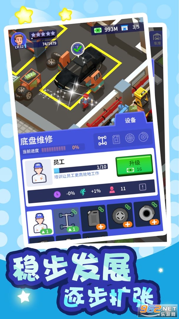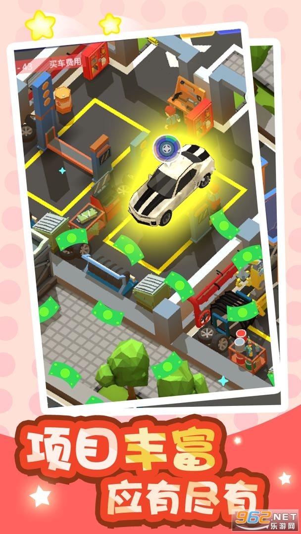 休闲卡通画风的模拟经营游戏,在这里需要我们经营的是二手车车厂,体验二手车经销,从来没有过的经营放置题材,全新元素全新玩法,将带给玩家全新的经营体验,游戏玩起来非常轻松惬意,赶快来试试吧。