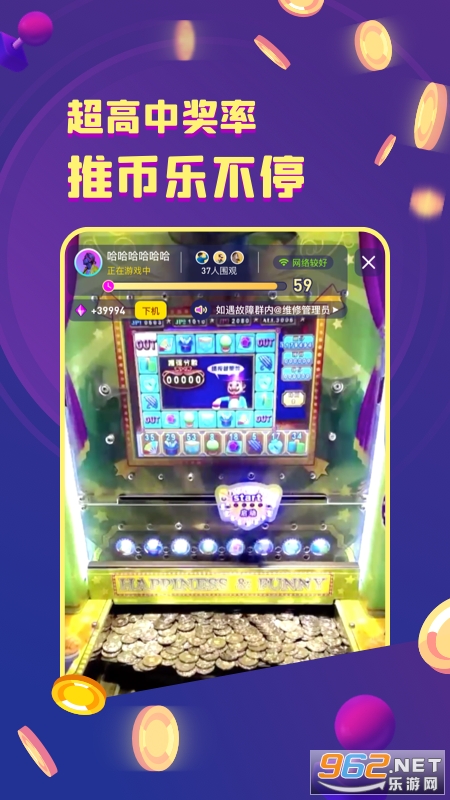 金币嘉年华是一款可以让你随时随地享受无限乐趣的APP,不仅有身临其境的线上抓娃娃,还有真实的推币机。让你一次玩个过瘾!