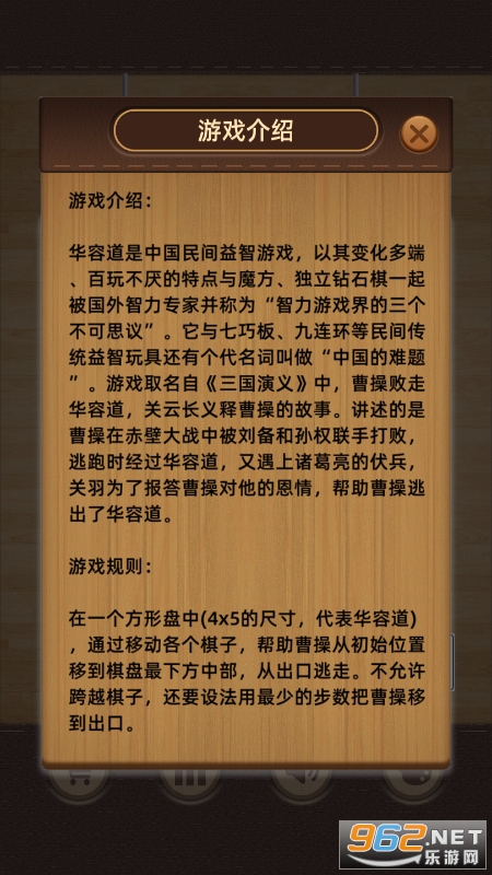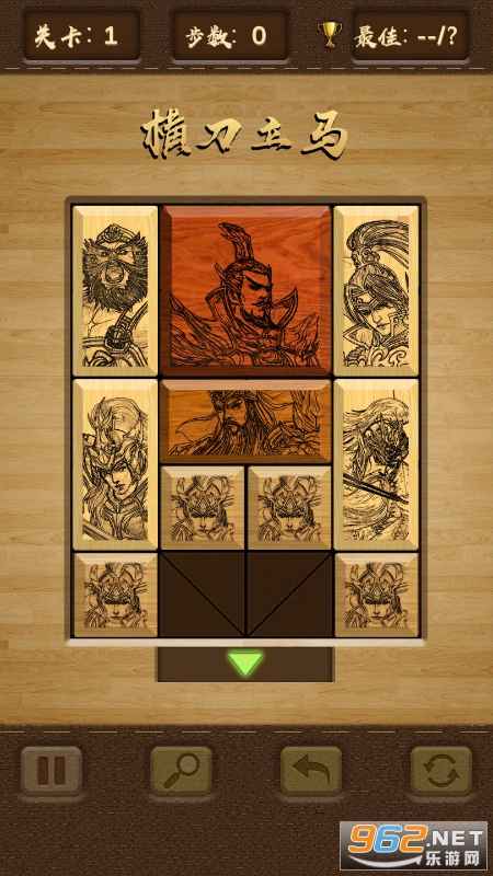 三国华容道游戏是一款古老的中国民间益智游戏,游戏中玩家需要通过移动各个棋子,帮助曹操从初始位置移到棋盘最下方中部,从出口逃走。不允许跨越棋子,还要设法用最少的步数把曹操移到出口。