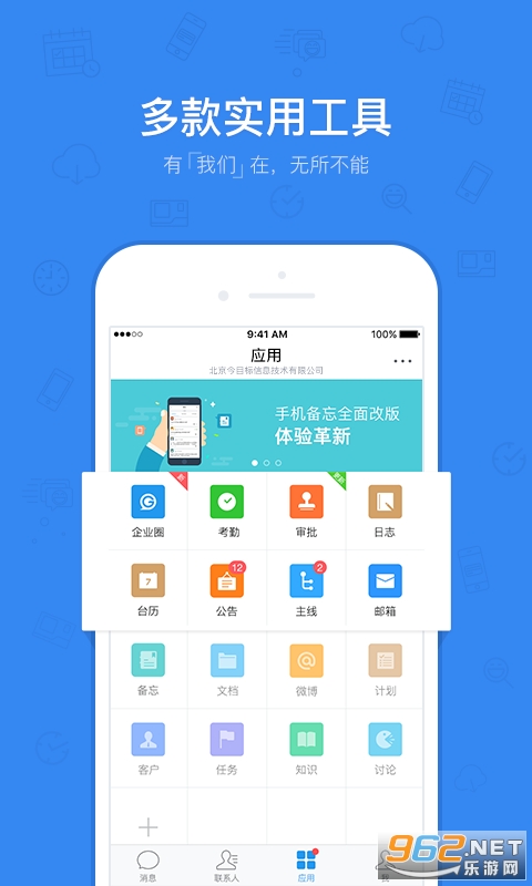 13、企业应用集合:满足企业日常办公需求,如:主线、台历、文档、客户、公告、备忘、审批、邮件、计划、任务、等,让工作更简单。