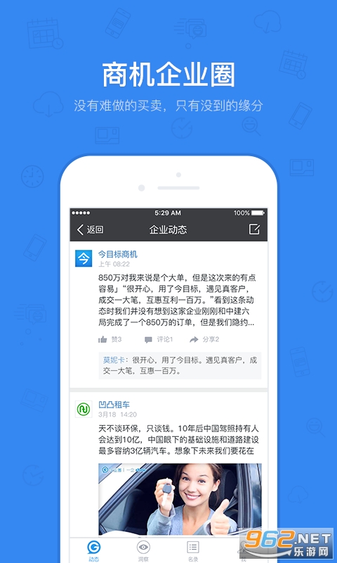 9、企业圈:随时随地发布您的公司新闻、产品动态、营销活动;有机会为近300万家企业用户提供产品和服务的同时,寻找本企业的合作伙伴,企业之间无缝沟通;