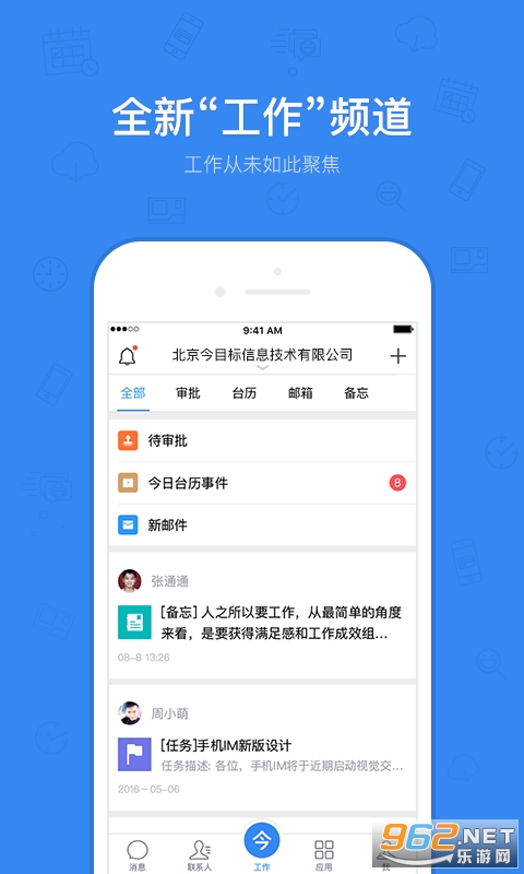 4、工作:“工作”频道,包含个人工作流汇总,待办事宜及快速发起业务,让工作真正聚焦;