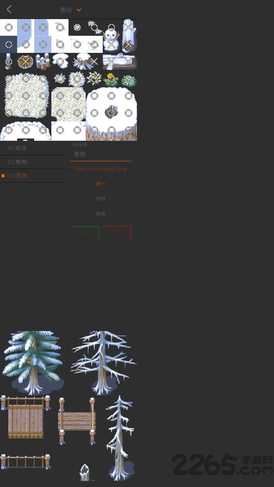 1、该编辑器提供了一些初始的地图素材,包括了雪地、树林、草地三个种类;