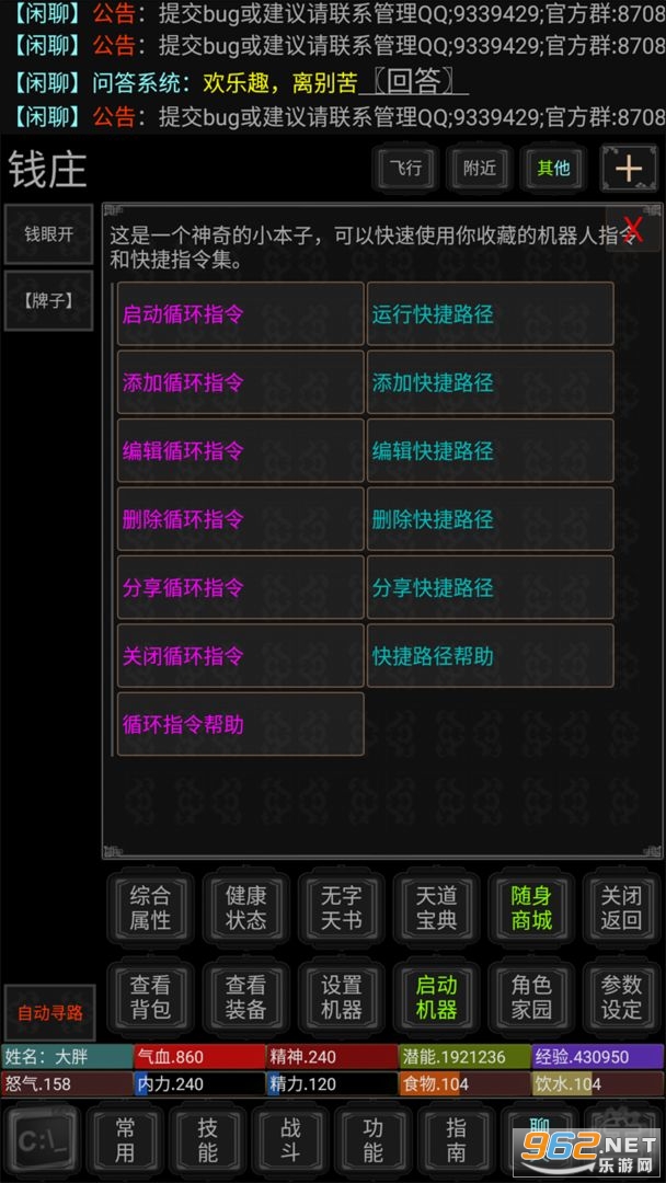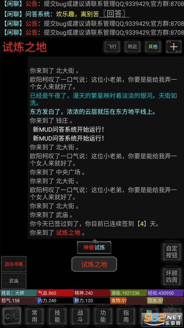 -多种多样的玩法(帮战,幽魂,火麒麟,随从,开心答题,轮回塔,登仙塔,幻兽,宠物,随机刺杀,挖宝,门派弟子下山,门派入侵,心魔入侵,神秘商人,年兽,跨服聊天,MUD及QQ群互通,宝镜任务,仆役系统,消耗潜能直接提升技能等级,跨服PK,精武试炼,十兵十甲,境界系统,十兵相克....)