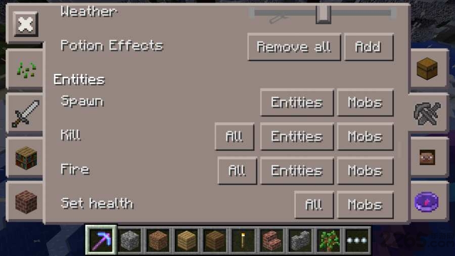 在Potion Effects栏,我们能直接添加各种药水的buff,不用再酿造药水喝药了Spawn模式下,选择实体或者生物,能实现类似生物蛋的功能,选择好要生成的实体或者生物,点击地面就能生成了:Kill栏,我们能选择要杀死的生物或者实体,或者是将地图中的所有物品清除Fire栏同上,能选择让什么东西着火,生物烧死之后掉的是熟肉哦!Set health模式下,能自由设置生物的血量: