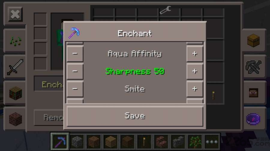 进入物品界面,我们能看到背包里的各种物品,还能通过附魔按钮直接附魔物品,可以为各种物品附魔,不光是武器和工具,草方块也能附魔!