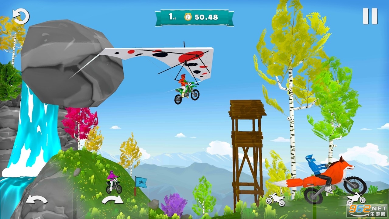 一款卡通风格的滑翔越野游戏,游戏中你将通过滑翔翼来飞跃各种障碍,尽可能保持在空中进行滑翔,超越你的对手,同时你需要注意落地的时机和角度,成功落地获得冠军,推荐给喜欢摩托竞速游戏的玩家。