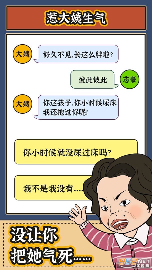 通过机智的回答来跟亲戚们斗智斗勇吧,怼人很爽但要注意通关目标哦~