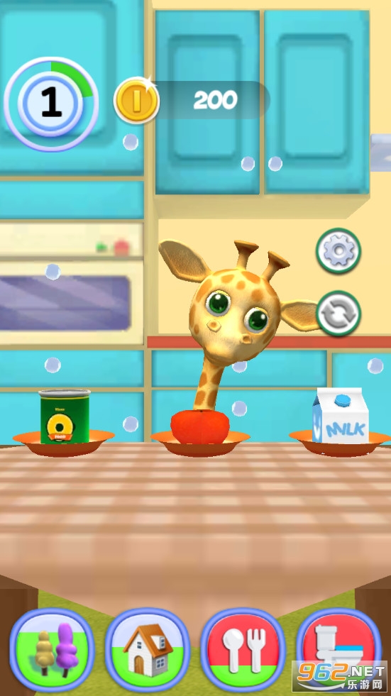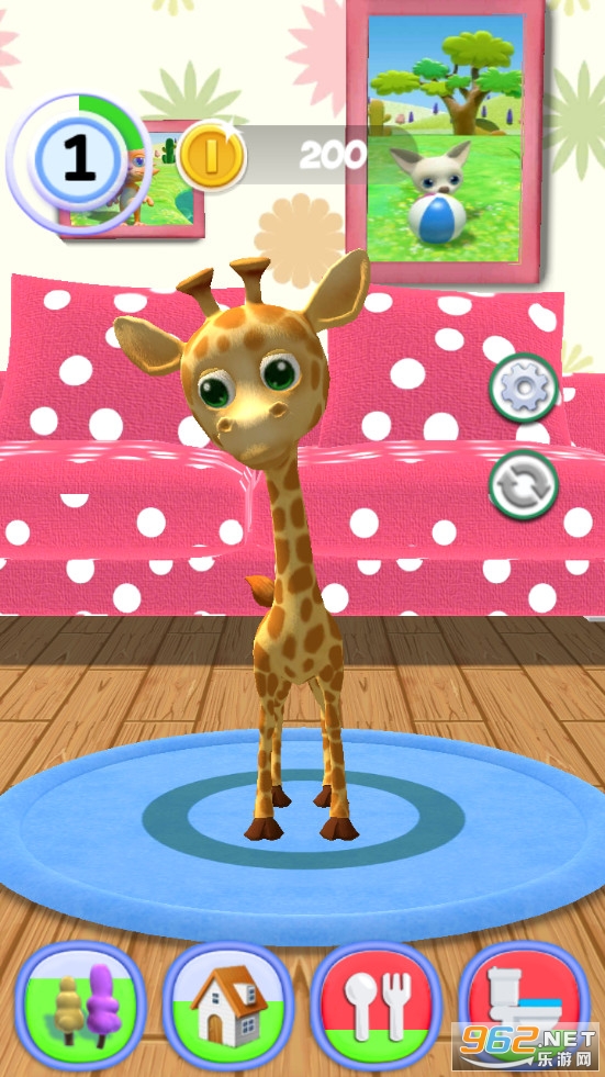卡通长颈鹿模拟说话游戏,适合小朋友们玩,有着众多的模式可以选择,可以设置房屋、更改长颈鹿颜色,可以喂胡萝卜、牛奶、香蕉等食物,可以喝水、照镜子等等,玩法多样。
