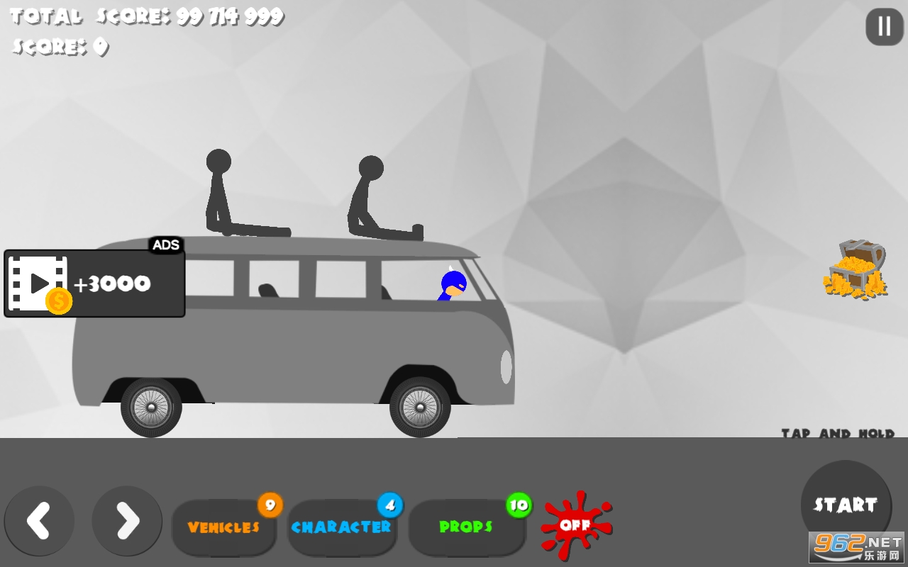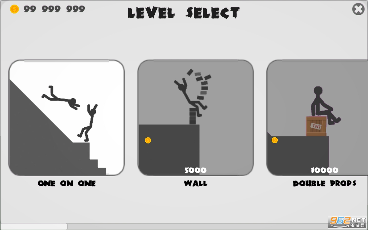 游戏会综合火柴人的摔落滞空时间以及翻滚情况和受伤碎裂情况来给予玩家金币奖励,试着用不同的力度和姿势来解锁金币吧,游戏中的金币非常的有用,可以用来解锁更多危险的载具和奇葩的关卡,新载具和新关卡可以让火柴人死的更壮烈,给予的奖励也越多,目测共有20关地形和18种车辆装备可供选择,从这方面来看,游戏的耐玩度还是非常高的。