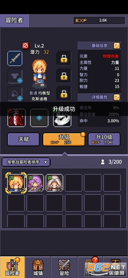 开始组建你的冒险小队!每一位冒险者都是独一无二的,不同的冒险者拥有不同的技能,巧妙地组建你的配队,为冒险者们佩戴装备,使他们的战斗更加得心应手。