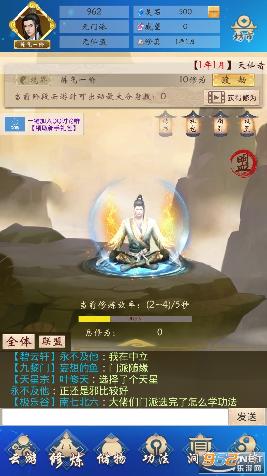 《云游修真界安卓版》是一款画面精致的采用竖版玩法的放置修仙类RPG手游,游戏中玩家将扮演一个修士去冒险,可以修炼打坐,积攒真气,渡劫进阶,有着功法、洞府、历练、云游等众多的玩法可以体验,可以加入门派学习强力的仙法等等。