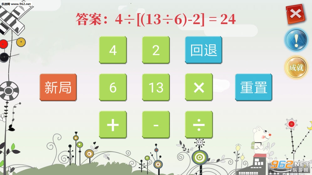 趣味的益智烧脑游戏,游戏可以利用加减乘除来让四个数形成一个等于24的等式,支持分数运算,考验玩家的智慧,喜欢的朋友可以下载试试。