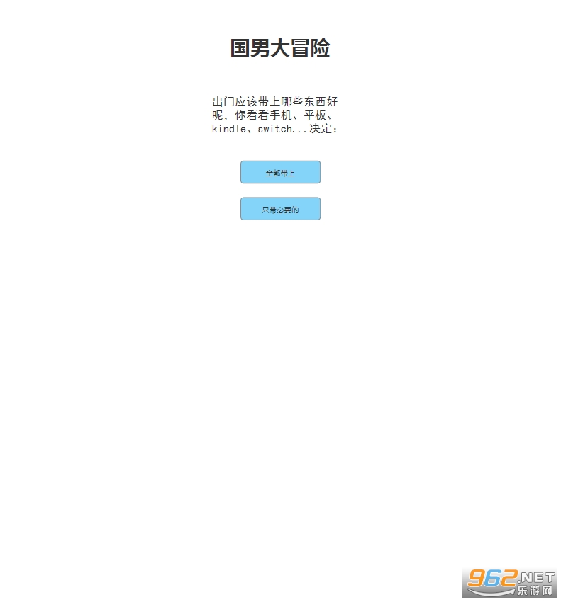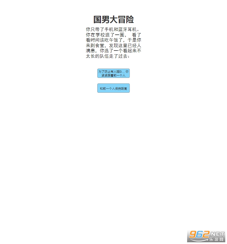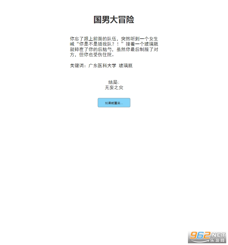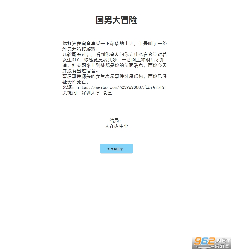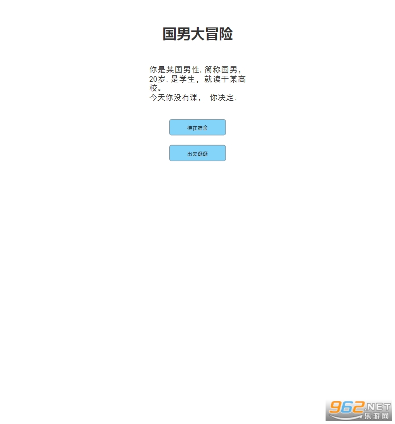 《国男大冒险小游戏》是一款文字类型的趣味小游戏。玩家扮演某国男性,在没有课的情况是选择是待在宿舍还是出去逛逛,出去逛逛的话又会选择带什么,待在宿舍的话会干嘛,一步步的进行选择,看看你最后会经历什么,剧情比较的奇葩和无厘头,不同的选择会有不同的结局~