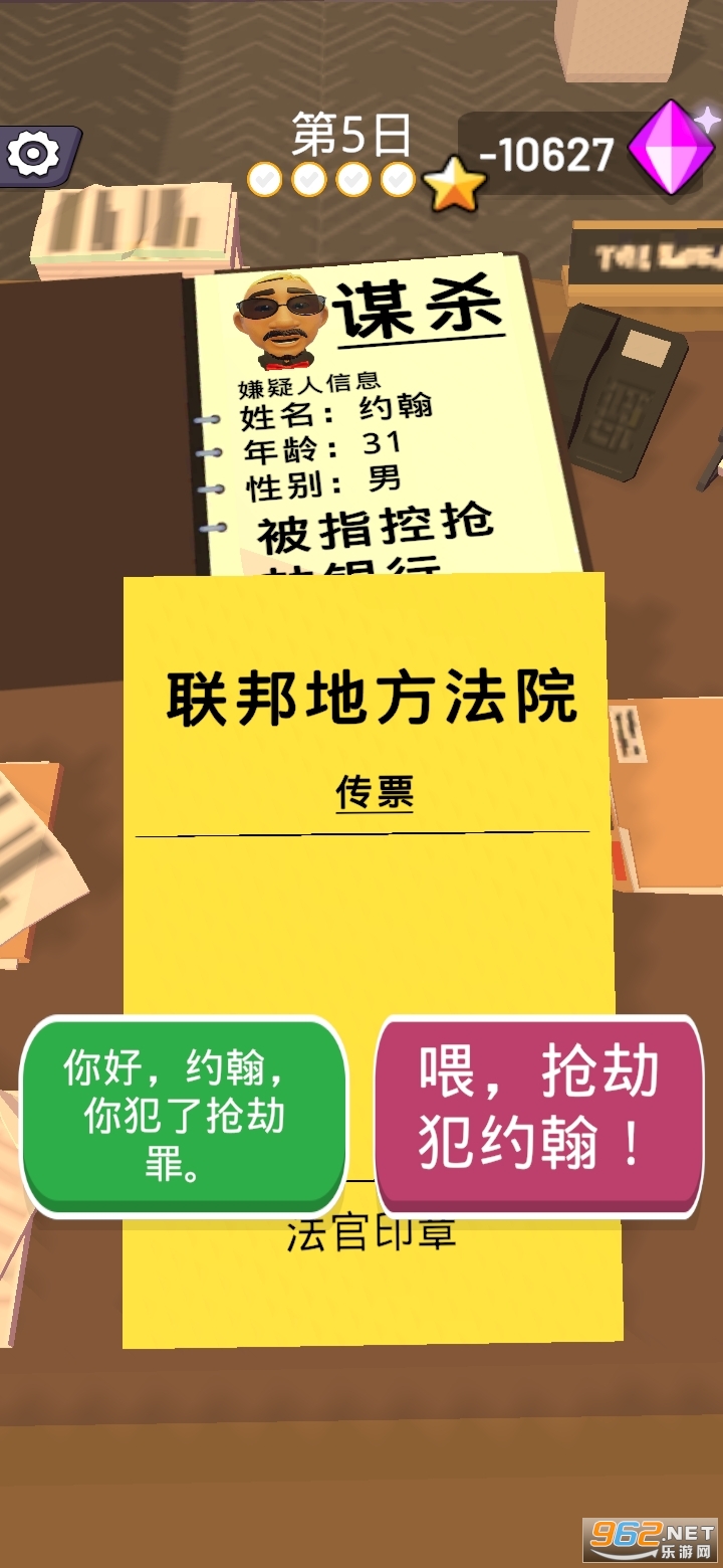 《法官我最大》是一款非常好玩的休闲模拟类游戏,简单的游戏玩法,轻松的游戏体验,不但可以打发无聊的时间,还能体验轻松的休闲模拟游戏的乐趣和体验,操作简单,玩法轻松,感兴趣的朋友还在等什么?欢迎来962下载吧!