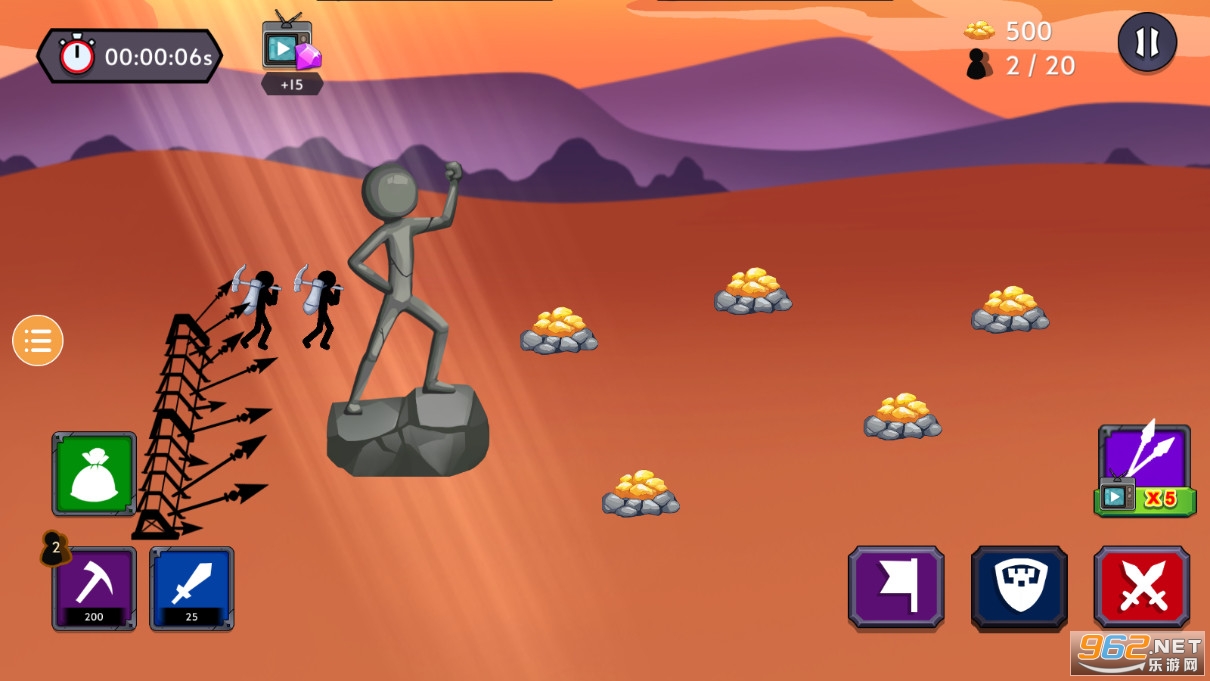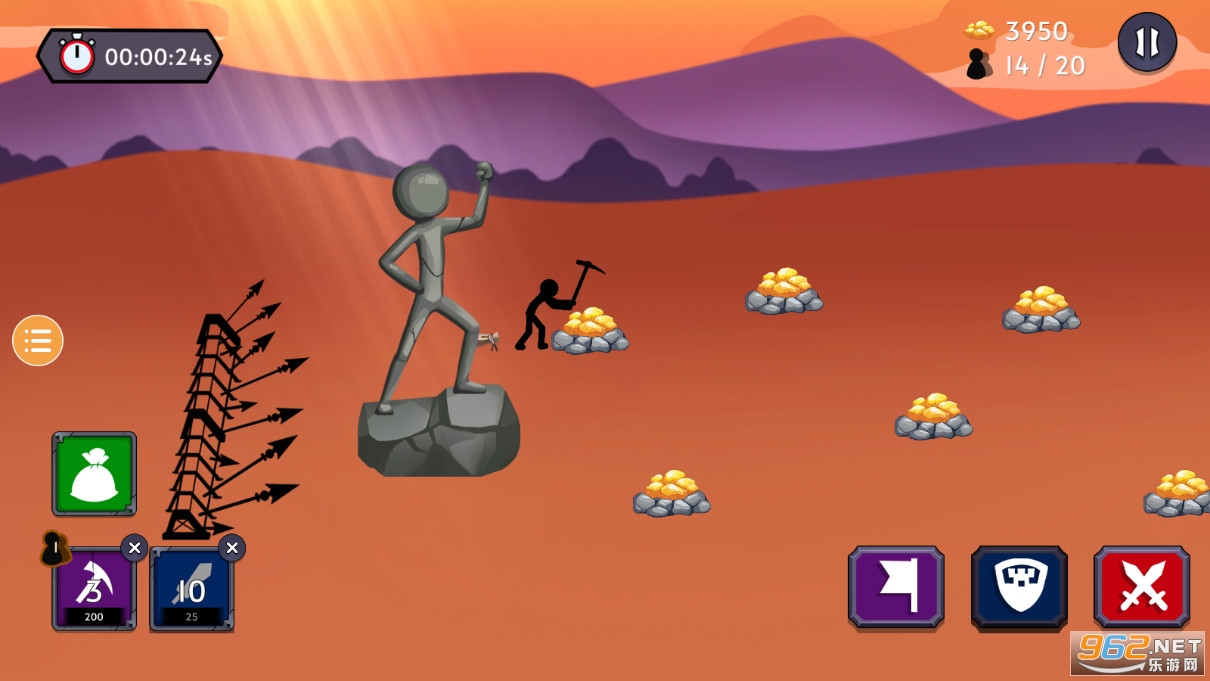 建造矿工来收集珍贵的黄金和宝石,您可以用它们来购买火柴人派对战士:矿工、剑士、弓箭手、重装步兵、巫师、小黄人、弹射器、塔