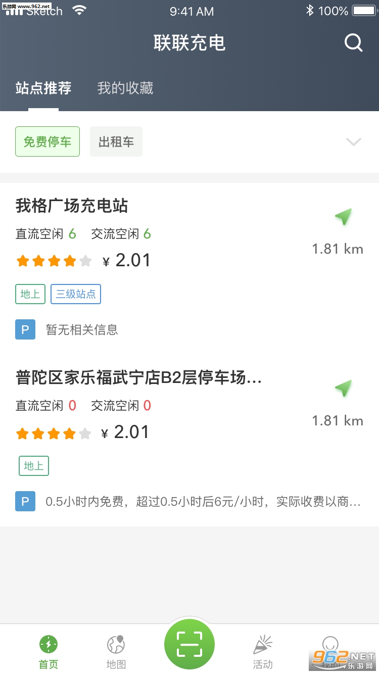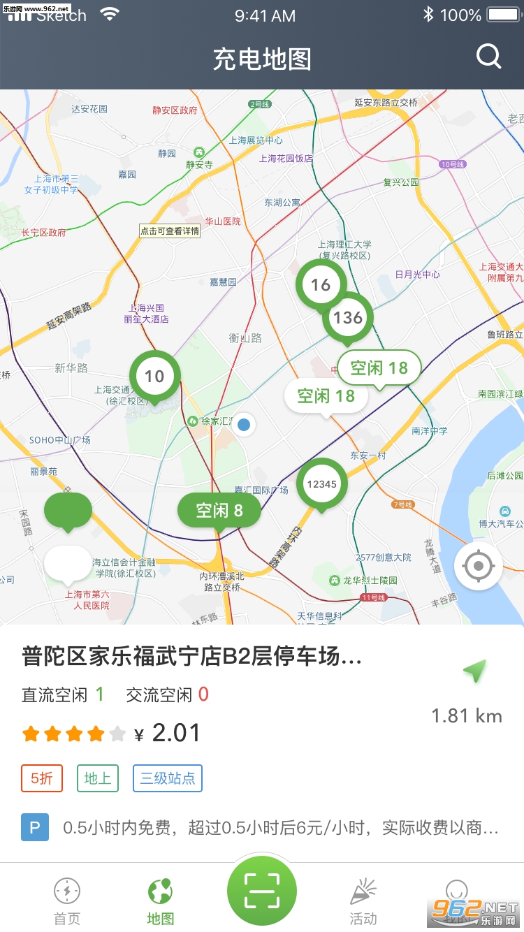 充电地图界面查询:根据用户的实时位置进行定位并展现用户周围的专用桩与公共桩位置,用户选择点击选择的站点,即可查看站点详细信息,包括充电桩数、距离、电费、支付方式、开放时间、物业类型及车位数量。