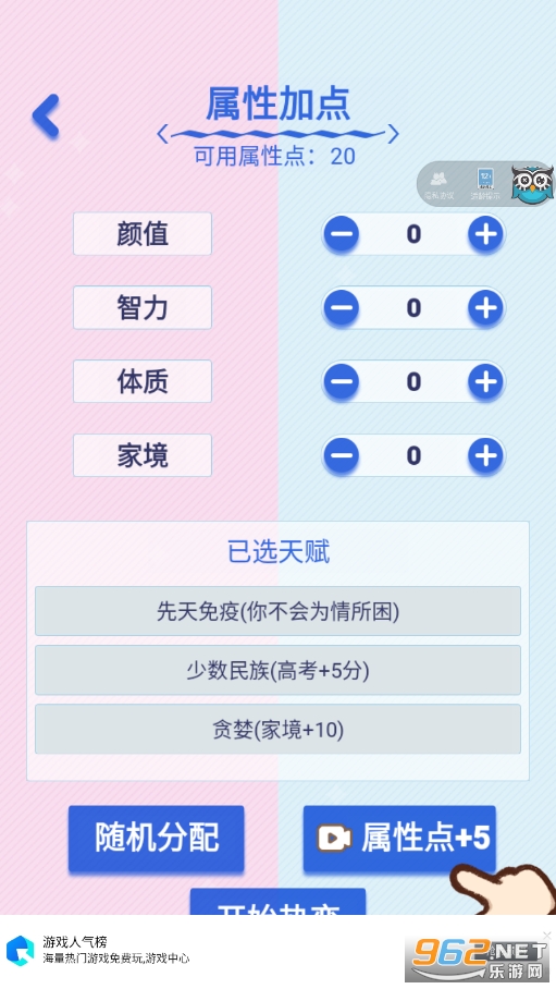 《恋爱重开模拟器》是一款类似人生重开模拟器的游戏,只不过换成了以恋爱为主题,进入游戏之后玩家可以选择真爱十连抽或者恋爱十连抽,选择天赋,对颜值,智力,体质,家境等方面进行赋值,然后开启自己的恋爱之旅,看看不同的选择之后你会有哪些独特的恋爱经历!