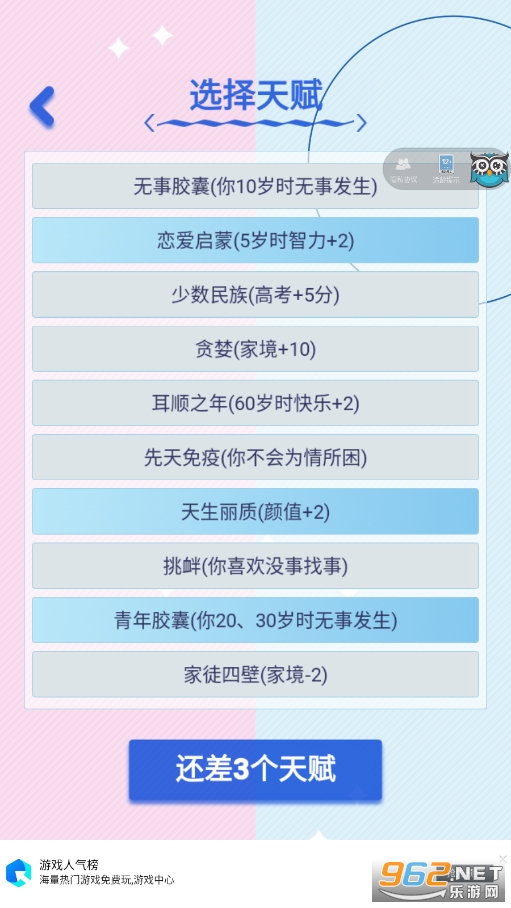 2、模拟人生类的游戏,选择改变自己的颜值,家庭,智慧,运势等等来改变你的恋爱经历;