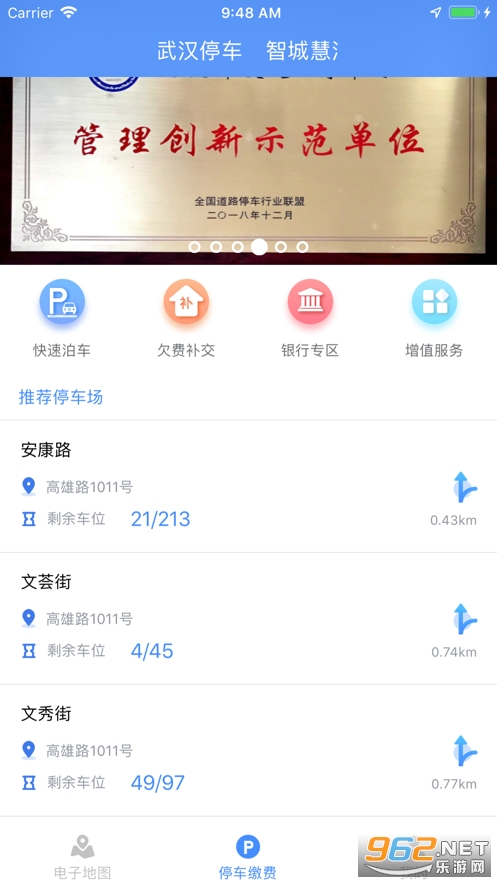 为武汉车主提供路边停车的查询,导航,搜索功能, 通过软件可知晓周边停车场的泊位空闲情况,并迅速到达泊车地点快速泊车。