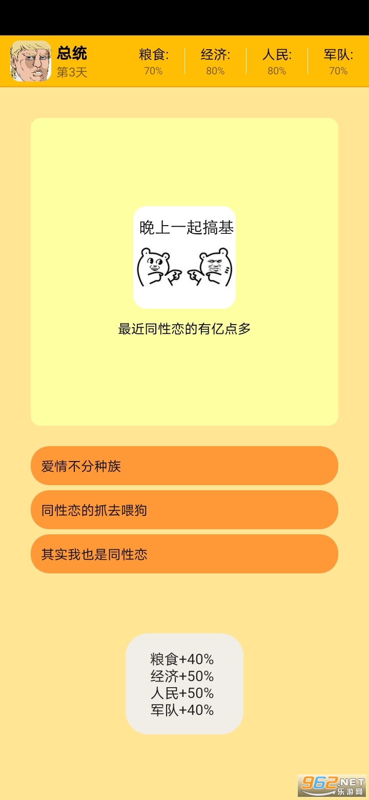 《我是总统安卓版》是一款非常有趣的角色扮演类手游,游戏中玩家将成为一名总统,这是你的国家,你可以自由地做任何事情! 但不要忘记,每一个行为都是积极的和消极的。不是每个人都能实现他们的愿望,因此,你必须能够成为一个公平的总统。 欢迎下载!
