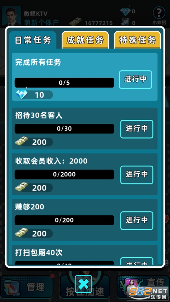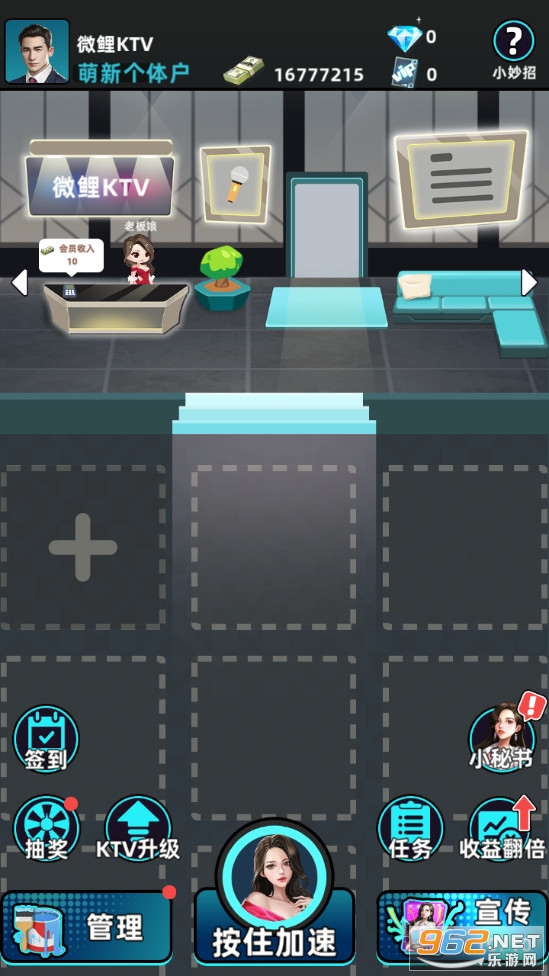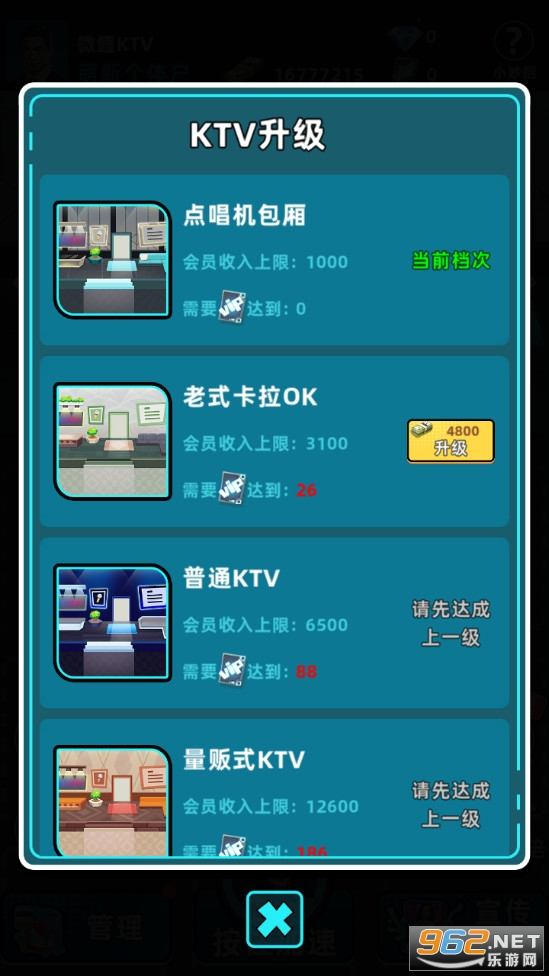 1、从简单的入门KTV开始白手起家,建立包厢,升级设施。