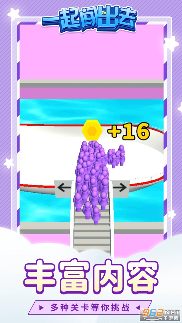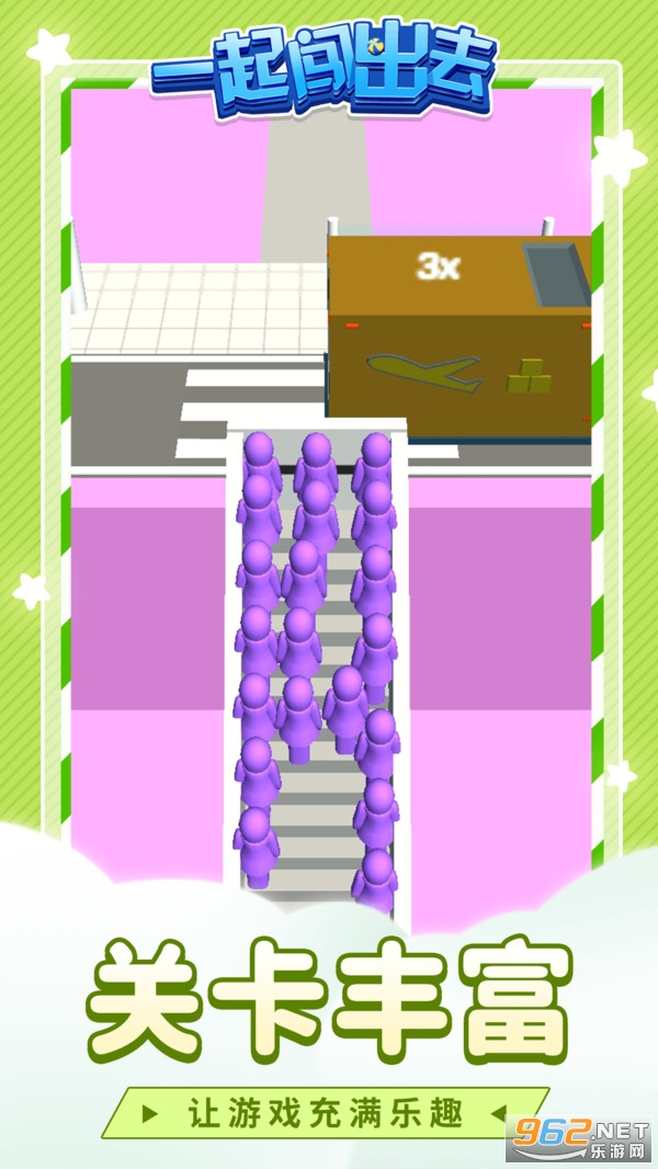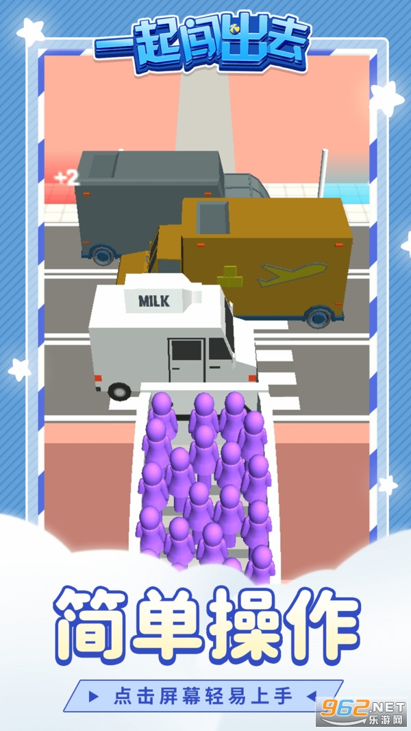 一起闯出去是一款轻松休闲的小游戏。简单操作,让更多的小人通过马路,搭上轮船,一起闯出去!只需动动手指,点点屏幕,就能操控小人前进让小人快速通过马路,小心来往车辆,不要让小人被撞飞!控制小人穿过不同的光门,让队伍不断壮大!趁轮船经过时,让小人们都跳上船!快来加入,与小人一起闯出去吧。