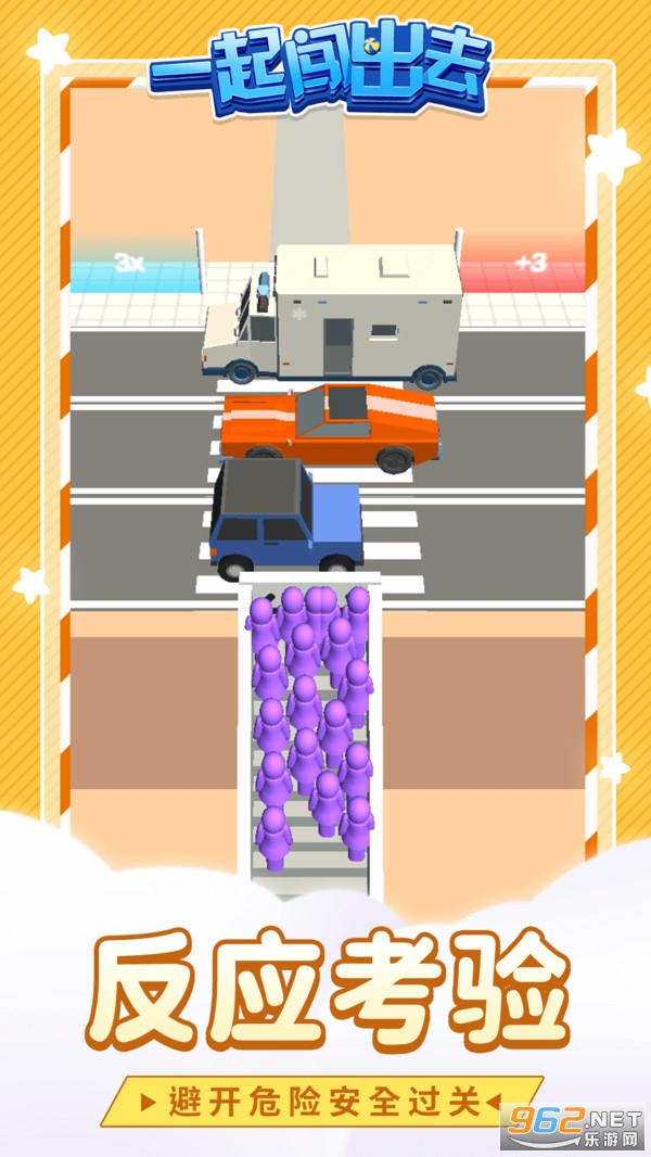 《一起闯出去》是一款魔性的休闲闯关游戏,同时操作一群小人过马路,有时候还要等上轮船或者货车,尽量避免不要让人群被马路上正常行驶的汽车冲散,或者单个小人被汽车撞飞,在有些关卡场景中我们还有竞争对手,娴熟的操作能让你成功挤掉竞争对手并夺得第一名。