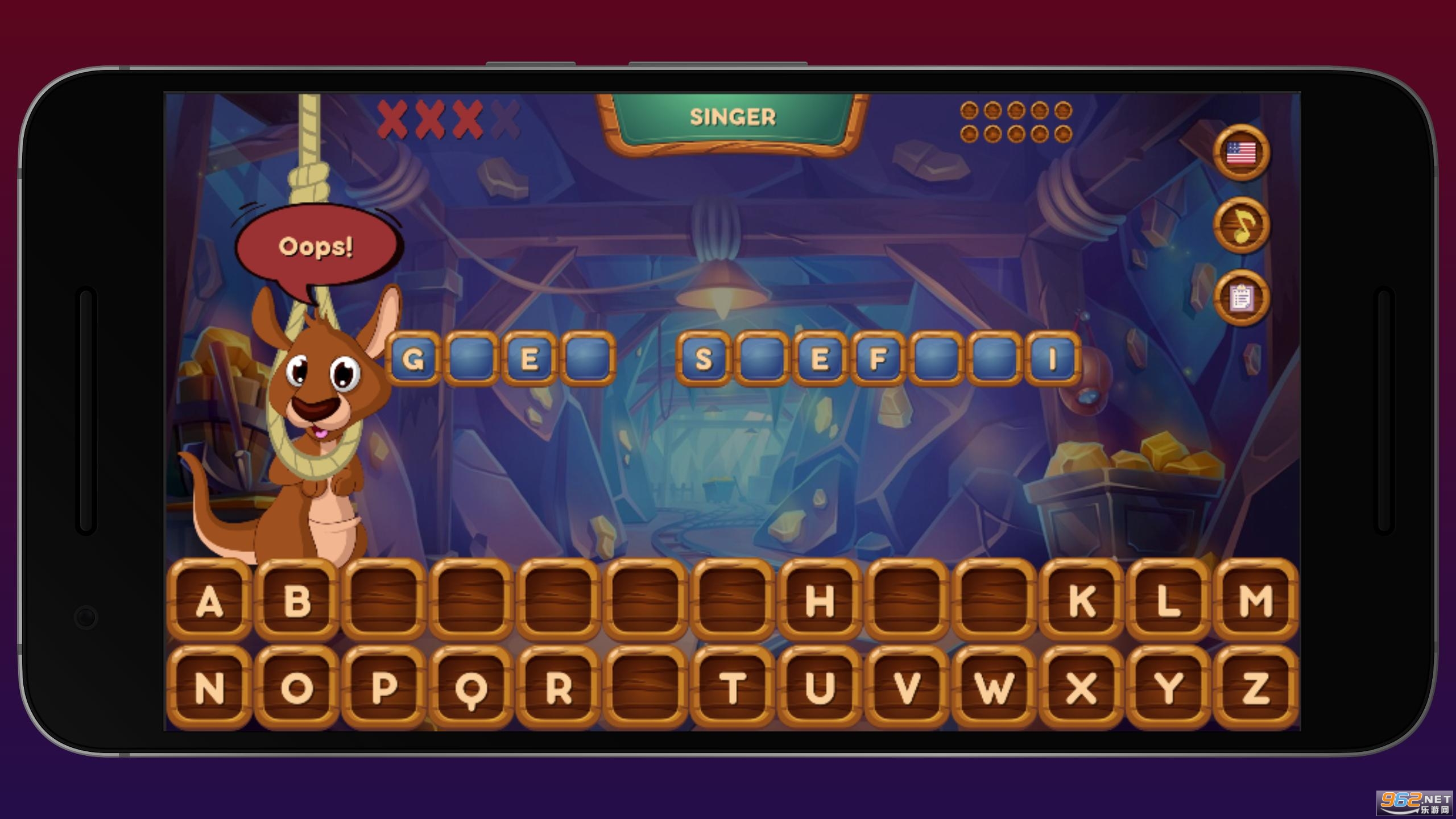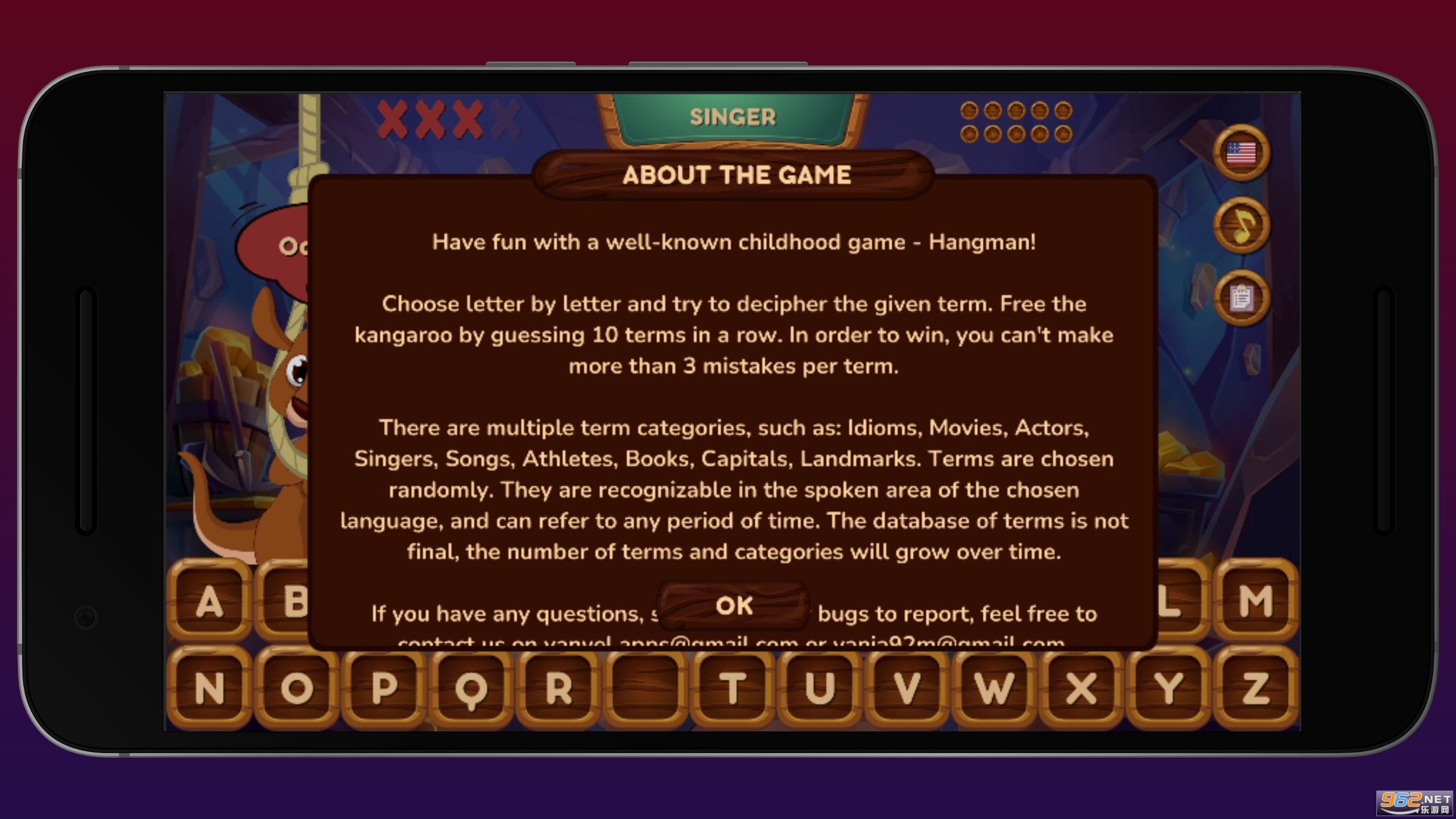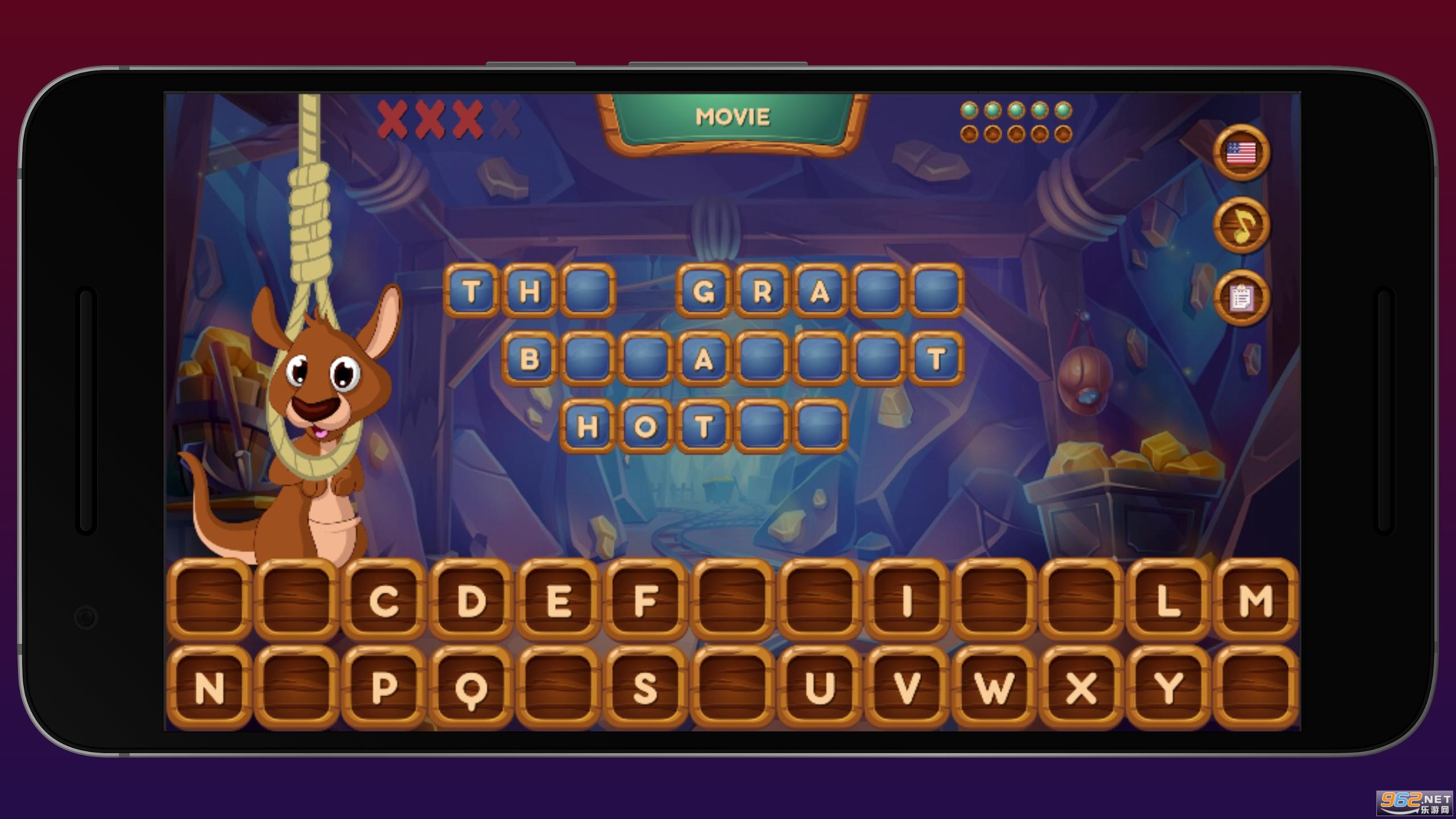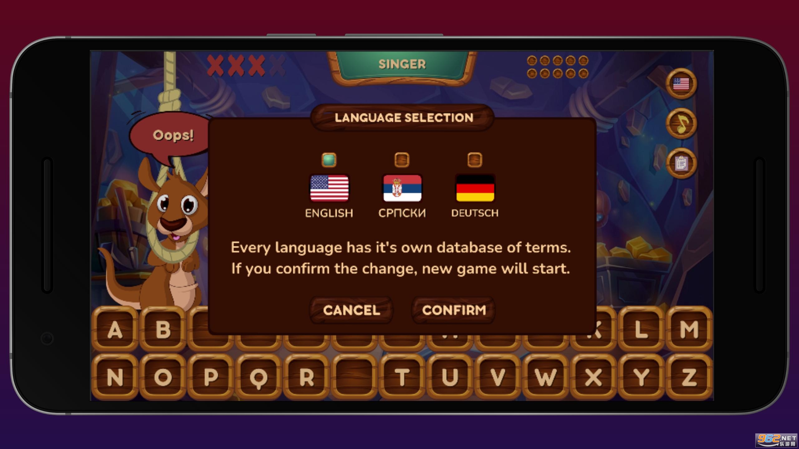《Hangaroo》是一款猜词游戏,给出单词中的几个字符,来猜出完整的单词,涵盖短语、电影、演员、歌曲、歌手、地标等多个类别,可以选择英语、德语进行游戏。