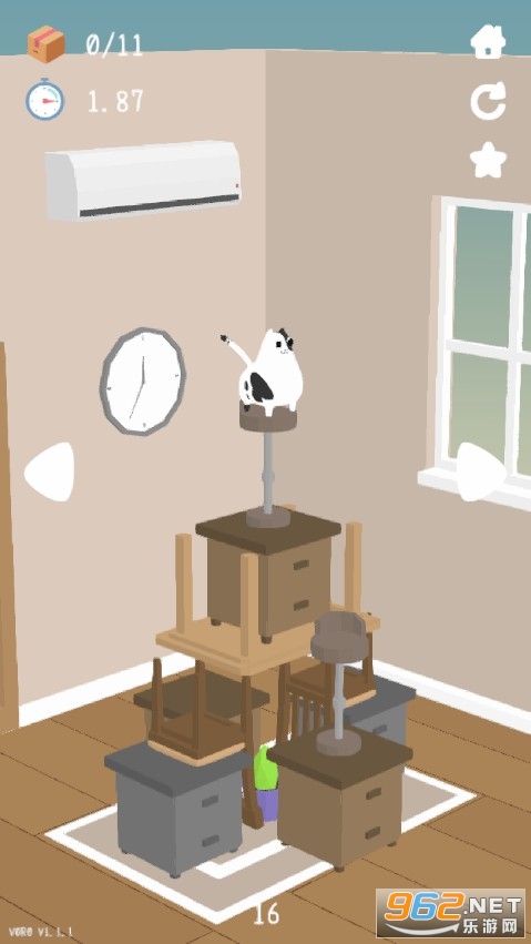 这款游戏玩起来非常轻松,房间内所有的家具全部堆积在一起,通过手指戳戳戳点击就能消除这些家具了,也不需要特定的按照顺序去消除,大家也可以按照自己的方法杂乱无章的去消除,只要最后不要让猫咪掉落下来或者摔倒就行。