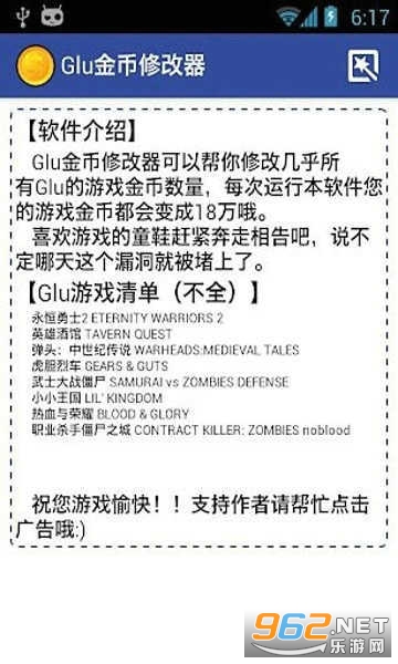 可以帮你修改几乎所有Glu的游戏金币数量,每次运行本软件您的游戏金币都会变成18万哦。无需ROOT!!