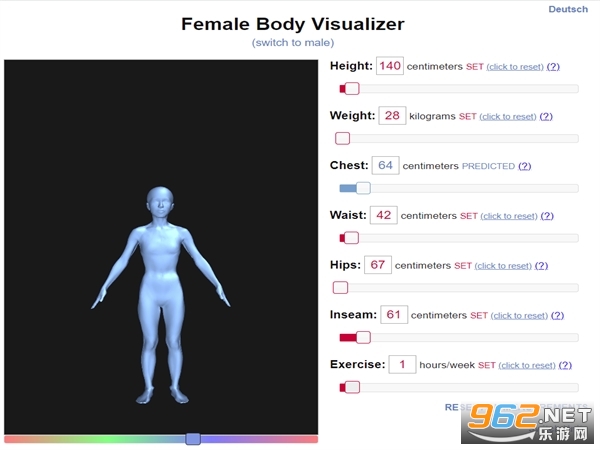 《身材模拟器》是一款非常专业的能够对身材进行模拟的休闲游戏,通过软件输入身材相关的各种数据就可以得到专业的人体魔性了,可以切换不同的性别。数据非常详细,甚至还能够查看锻炼一段时间后身材的变化情况,目前没有内置的中文版,但是大家可以用浏览器中的全页翻译来达到中文版的效果哦。