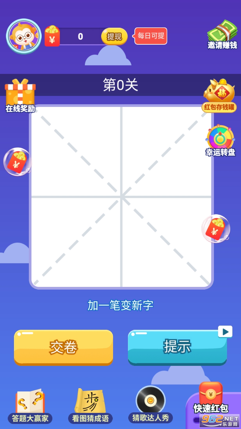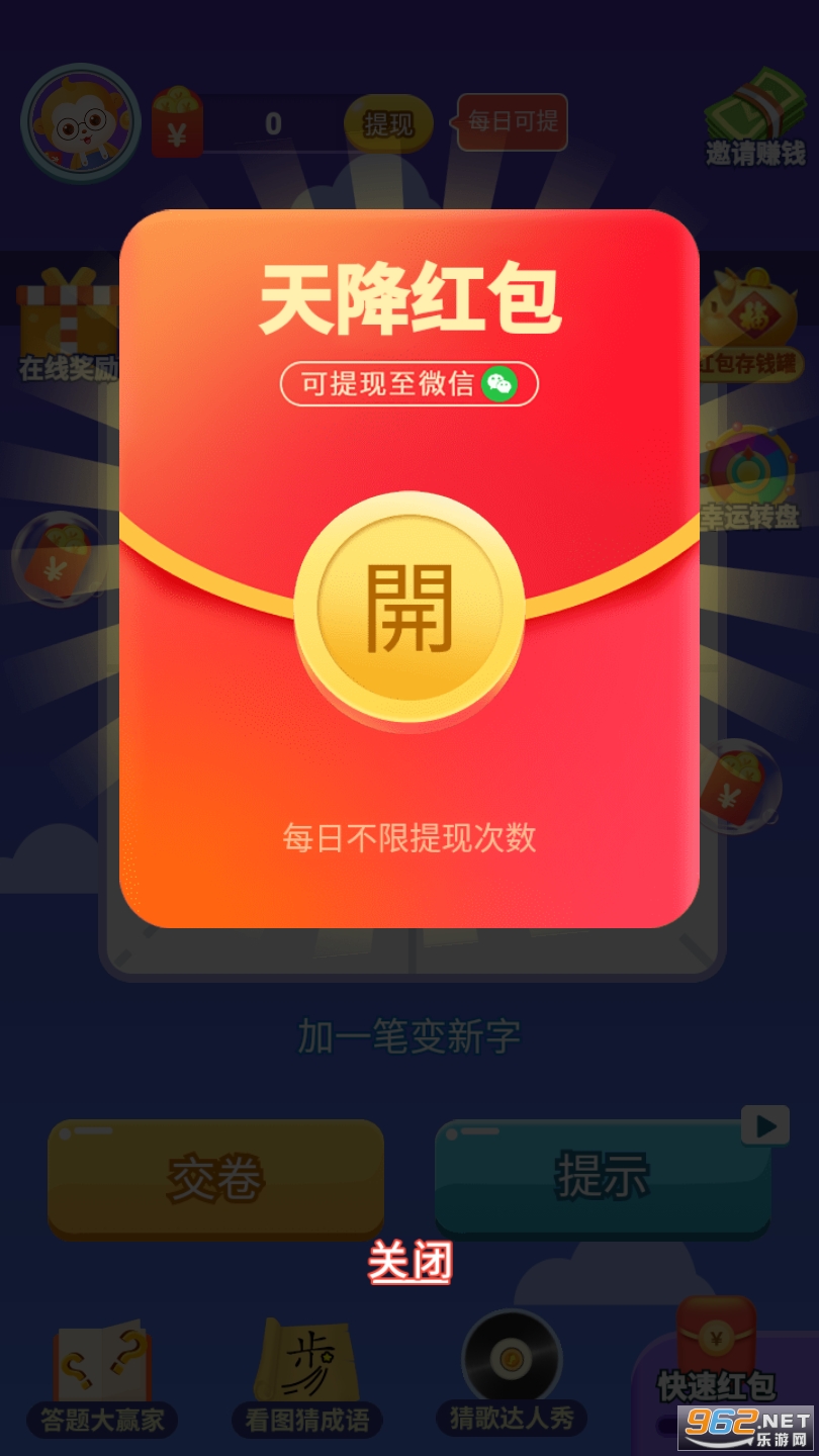 《疯狂的汉字红包版》给玩家们带来了一款好玩趣味的游戏内容,让各位玩家们可以在这款疯狂的汉字红包版中享受到玩文字游戏赚红包福利,让各位用户们在这里能轻松赚红包,下面就是小编为大家带来的软件下载地址!