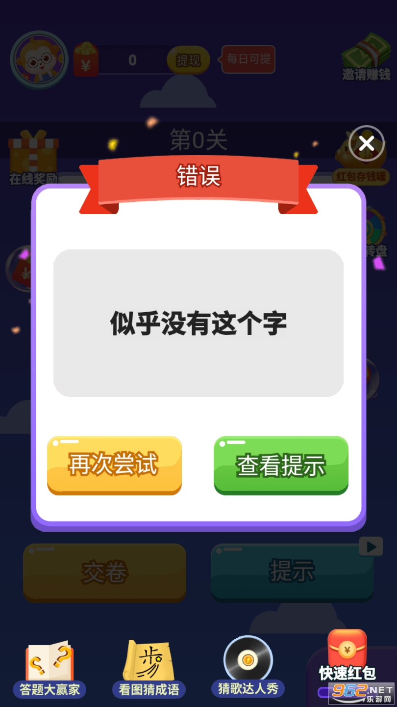 2、进行汉字的疯狂解谜的闯关的提示,拥有正确的答案。